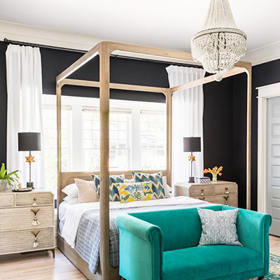 anchored by a four-poster bed with intricate carvings and a colorful Persian rug. In
