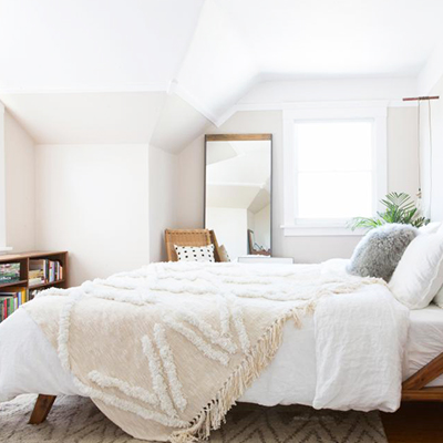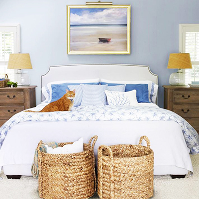 coastal bedroom that's full of woven textures and layers of color inspired by the sea